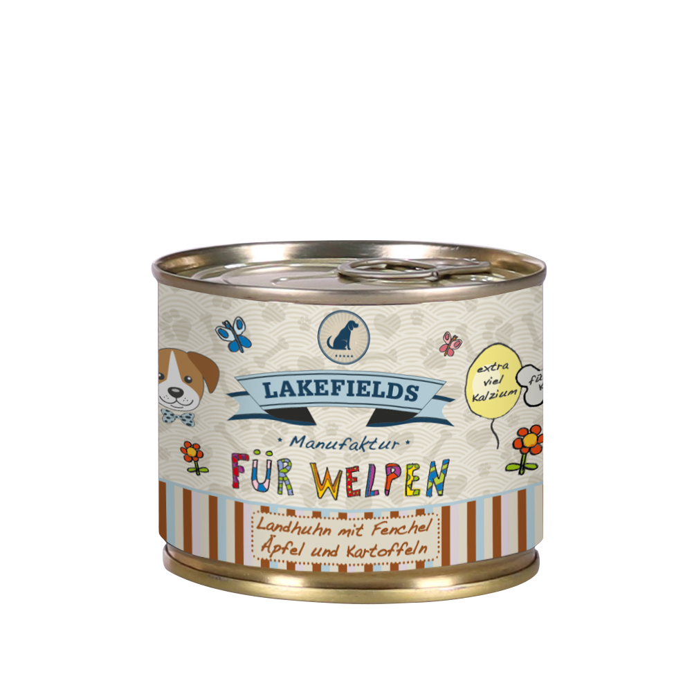 Im Lakefields Huhn-Menü für Welpen wird ausschließlich Hühnerfleisch (61%) als einzige Proteinquelle verwendet. Damit ist es auch für ernährungssensible Hunde geeignet. Hühnerfleisch ist fettarm und reich an Vitamin B6 und B12, Niacin, Kalium, Magnesium, Eisen sowie Zink. Durch Zugabe von frischem Obst und Gemüse wie Fenchel, Karotten, Kartoffeln und Äpfel entsteht eine gesunde, vollwertige und bekömmliche Mahlzeit für Ihren Hund. Das Dosenfleisch-Menü Huhn | Welpe ist ein Alleinfutter für heranwachsende Hunde.
