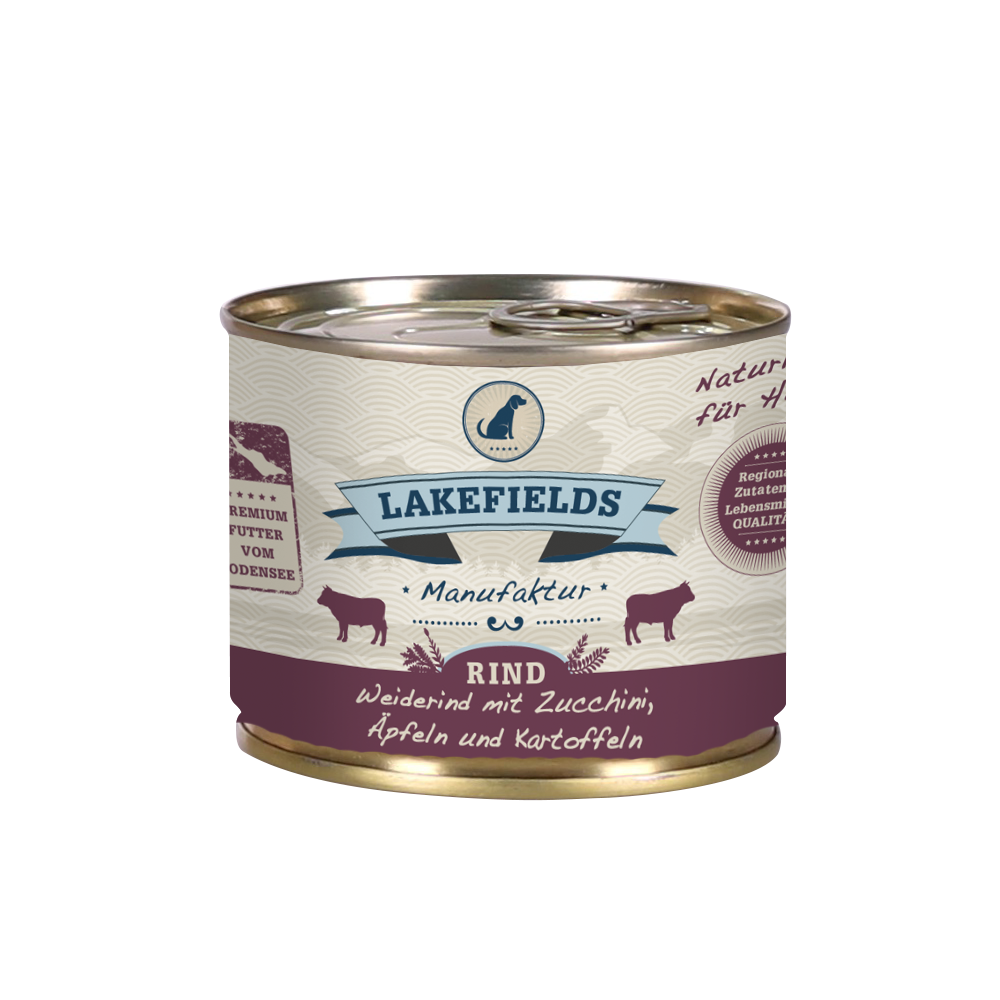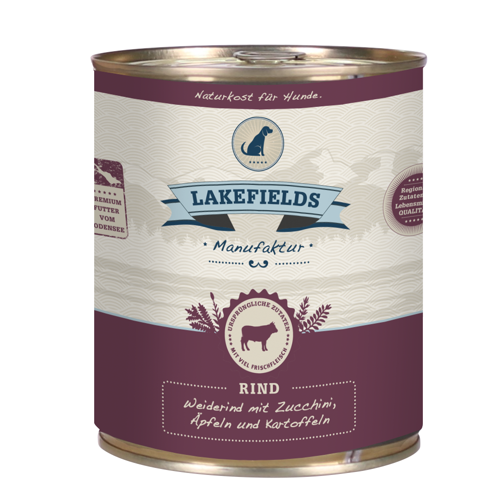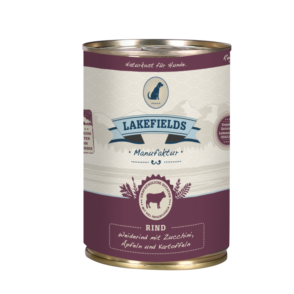 In Lakefileds Dosenfleisch-Menüs kommt das Beste, das die Region zu bieten hat: Frisches Fleisch, Gemüse und Kartoffeln aus nachhaltiger Landwirtschaft. Weitere natürliche Zutaten wie z.B. Rapsöl, Hagebutte, Leinsamen und Brennnessel runden das Menü ab. Schonend im Wasserbad gegart, entsteht eine leckere Mahlzeit für Ihren Liebling, die ihn mit allen wichtigen Vitaminen und Nährstoffen bestens versorgt.
